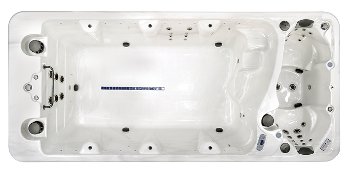 This low-impact warm water exercise swim spa comes with two relaxing spa seats